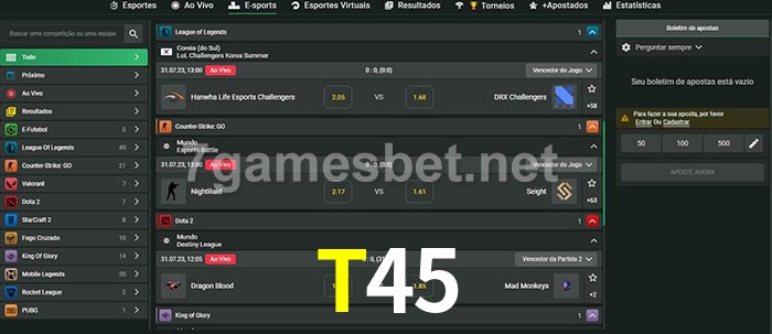 A aposta T45 oferece aos jogadores a experiência mais conveniente de apostas em eSports!